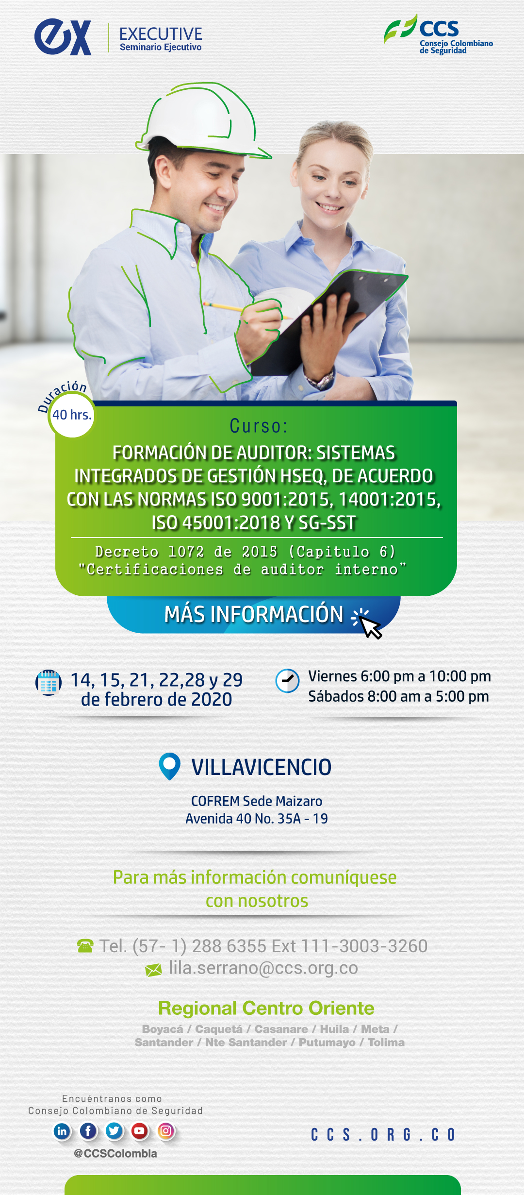 14Feb8:00 am5:00 amAUDITOR INTERNO HSEQ / VILLAVICENCIOVillavicencio. Normas ISO 9001: 2015, 14001:2015, ISO 45001:2018 y SG-SST8:00 am - 5:00 am TIPO DE FORMACIÓN:EXECUTIVECIUDAD:Villavicencio