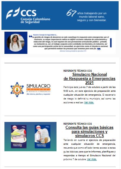 Estimado afiliado, en los 65 años del CCS, nos hemos encargado de trabajar en todos los sectores de la industria colombiana, ofreciéndote los mejores beneficios de pertenecer a la red de compañías y profesionales que trabajan por reducir la accidentalidad en el país y durante los últimos años hemos decidido acompañarte siempre, entregándote soluciones, conocimientos y herramientas prácticas para tu gestión.