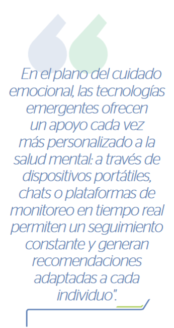 Al mismo tiempo, al liberar a las personas de cargas repetitivas y rutinarias, se facilita que puedan concentrarse en labores creativas, estratégicas o de mayor valor agregado, lo que potencia la motivación y el sentido de propósito. En el plano del cuidado emocional, las tecnologías emergentes ofrecen un apoyo cada vez más personalizado a la salud mental: a través de dispositivos portátiles, chats o plataformas de monitoreo en tiempo real permiten un seguimiento constante y generan recomendaciones adaptadas a cada individuo.