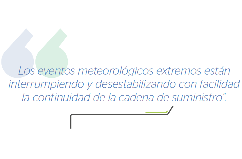 Un claro ejemplo de ello son las afectaciones que están generando las condiciones de cambio climático sobre las cadenas de suministro a nivel global. Los eventos meteorológicos extremos, las inundaciones, los incendios, entre otros, además de afectar a las comunidades, están teniendo un impacto directo sobre las infraestructuras logísticas, los centros de producción y la logística de distribución, interrumpiendo y desestabilizando con facilidad la continuidad de la cadena de suministro.