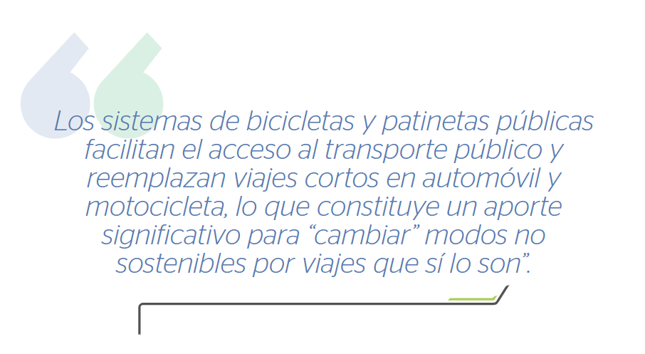 Los sistemas de bicicletas públicas (como el que acaba de estrenarse en Bogotá y que ya existen en muchas ciudades latinoamericanas) y los sistemas de patinetas compartidas (como los que infortunadamente dejaron de existir en las ciudades colombianas a raíz de la pandemia) son algunos ejemplos de ello. Estos sistemas de bicicletas y patinetas públicas tienen el concepto básico de facilitar el acceso al transporte público y reemplazar viajes cortos en automóvil y motocicleta, lo que constituye un aporte significativo para “cambiar” modos no sostenibles por viajes que sí lo son. En una primera etapa, estos sistemas se basaban en estaciones fijas ubicadas de manera aledaña a los paraderos del transporte público y los barrios, lo cual definía viajes pendulares (de la casa a la estación en la mañana y en sentido contrario en la tarde). Pero con los avances tecnológicos de años recientes se han podido implementar sistemas