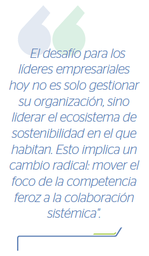 El desafío para los líderes empresariales hoy no es solo gestionar su organización, sino liderar el ecosistema de sostenibilidad en el que habitan. Esto implica un cambio radical: mover el foco de la competencia feroz a la colaboración sistémica.