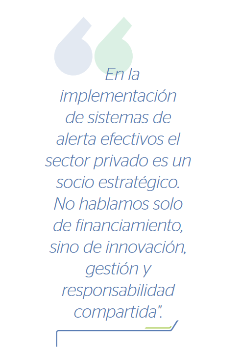 Así mismo, el sector privado tiene un rol muy importante aquí, las empresas son motores de transformación cultural para los trabajadores y sus familias, así como con las comunidades aledañas y se extiende a sus cadenas de suministro. A través de sus programas de capacitación y entrenamiento, sus acciones de responsabilidad social corporativa, iniciativas de sostenibilidad y resiliencia y la construcción de relaciones de colaboración con clientes y proveedores, pueden amplificar la educación y cultura sobre los sistemas de alerta temprana.