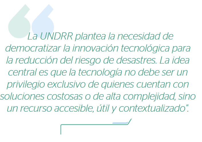 En este esfuerzo se inserta el recién publicado ‘Reporte especial sobre el uso de la Tecnología para la Reducción del Riesgo de Desastres’ ( Te ch-4DRR, por sus siglas en inglés), un informe de UNDRR que plantea la necesidad de democratizar la innovación tecnológica para la reducción del riesgo de desastres. La idea central es que la tecnología no debe ser un privilegio exclusivo de quienes cuentan con soluciones costosas o de alta complejidad, sino un recurso accesible, útil y contextualizado para empresas de todos los tamaños y comunidades en cualquier territorio. Tech4DRR impulsa el desarrollo y uso de herramientas inclusivas —desde aplicaciones móviles hasta sistemas de monitoreo locales— que permiten transformar los datos de riesgo en decisiones concretas y oportunas.