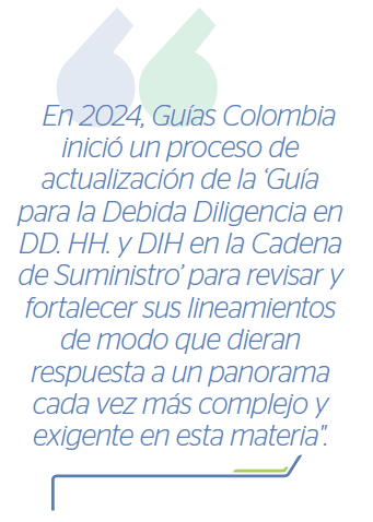 Teniendo en cuenta que estos principios continúan más vigentes que nunca, en 2024, Guías Colombia, inició un proceso de actualización de la ‘Guía para la Debida Diligencia en Derechos Humanos y Derecho Internacional Humanitario en la Cadena de Suministro’ para revisar y fortalecer sus lineamientos de modo que dieran respuesta a un panorama cada vez más complejo y exigente en esta materia.
