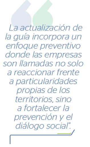 Adicional a lo anterior, la actualización incorpora un enfoque preventivo donde las empresas son llamadas no solo a reaccionar frente a particularidades propias de los territorios, sino a fortalecer la prevención y el diálogo social.