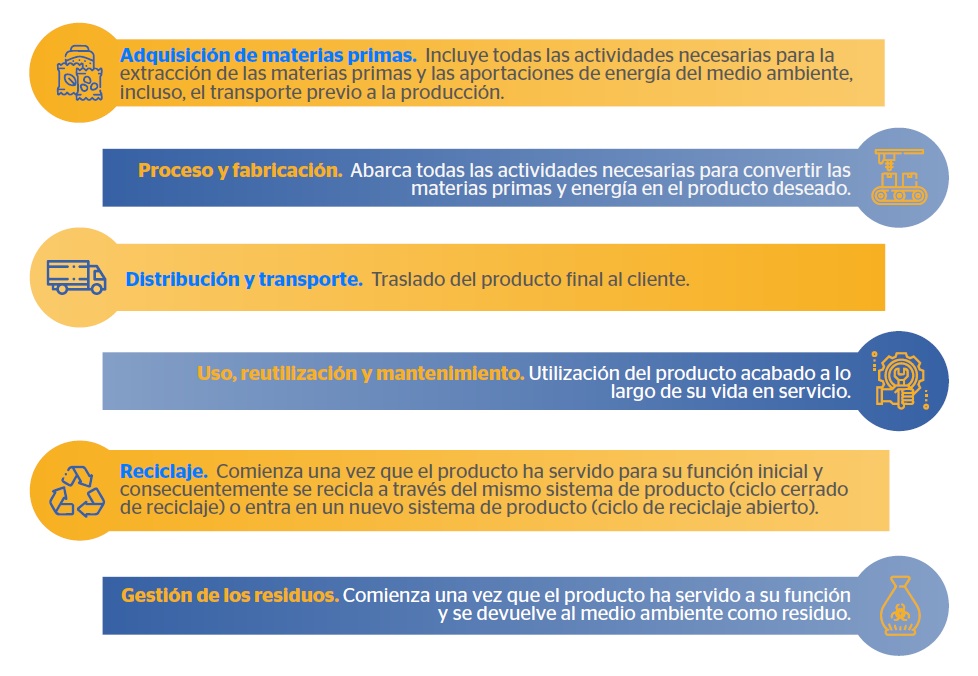 El ciclo de vida corresponde a las etapas consecutivas e interrelacionadas de un sistema del producto, desde la adquisición de materia prima o su generación a partir de recursos naturales hasta la disposición final7, pasando por las siguientes etapas8: