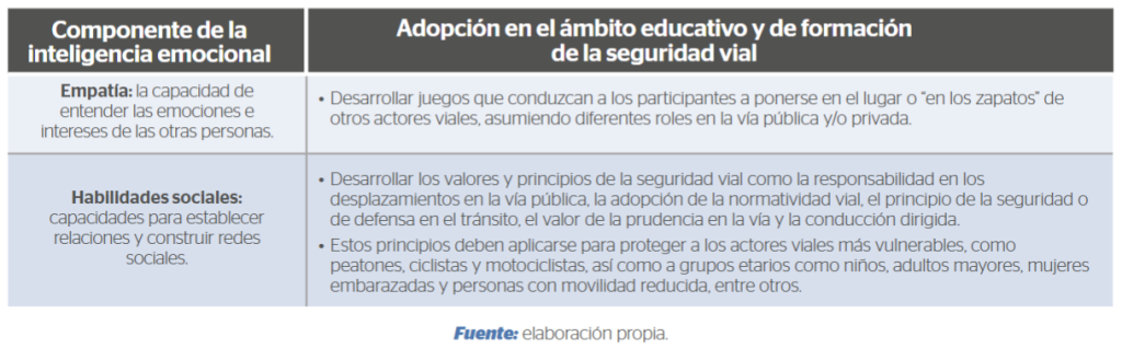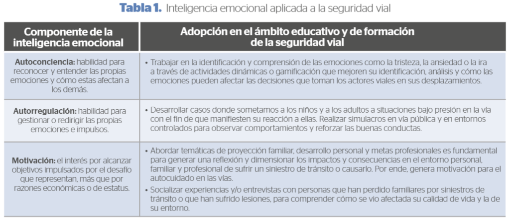 Lo anterior implica la capacidad de identificar y controlar las emociones que pueden influir negativamente en la toma de decisiones ya sea al caminar como peatón, conducir o desplazarse como pasajero y entre las que se incluyen la tristeza, la ansiedad, la preocupación, el miedo o la ira. Por lo tanto, al incorporar la inteligencia emocional en la educación vial de los niños y al aplicar estas mismas herramientas en la formación de competencias ciudadanas, así como en las capacitaciones empresariales en gestión del riesgo y seguridad vial, se puede contribuir a mitigar o reducir los siniestros de tránsito relacionados con el factor humano el cual representa más del 90 % de las muertes en siniestros viales a nivel mundial (Stanton & Salmon, 2009).