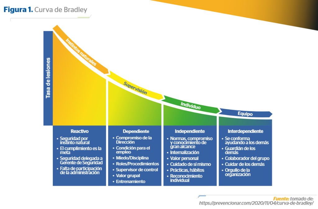 4. Interdependiente: la seguridad se convierte en un valor compartido; los trabajadores se cuidan entre sí.Este enfoque, representado en la llamada “Curva de Bradley”, permite visualizar cómo una organización puede evolucionar desde el control externo hacia una cultura de cuidado mutuo e interdependiente.