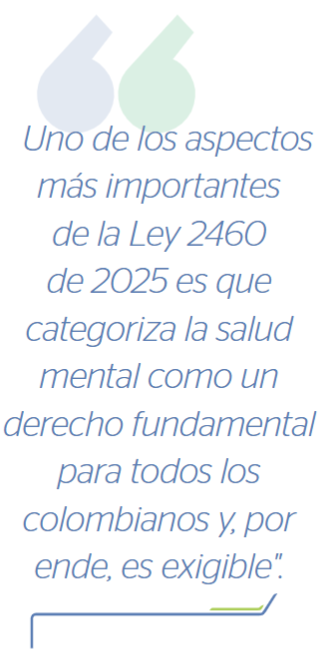 La Ley 2460, promulgada el 16 de junio de 2025, representa un avance importante en materia de política pública en Colombia para brindar atención integral e integrada a la población que sufre las consecuencias de las enfermedades y trastornos mentales.