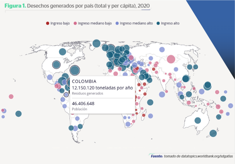 Según el PNUMA (2024), las zonas urbanas hacen uso del 75 % de los recursos y producen alrededor del 60 % de los desechos mundiales. En 2020, fueron generados 2200 millones de toneladas de desechos en todo el mundo (Kaza et al., 2023). En ese sentido, una de las problemáticas latentes que enfrentan los centros urbanos es la cantidad de residuos que se producen a diario, en razón al crecimiento demográfico y el aumento de los ingresos. Por ejemplo, en 2020 Colombia produjo 12.150.120 toneladas de desechos tal y como se ilustra en la figura 1.