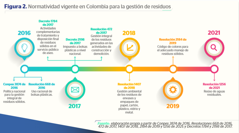 En lo que respecta a dicho país, el avance del cumplimiento del ODS 11 a partir del informe anual reportado por el DNP (2024) es del 58,4 %. [AB1] En atención a esta problemática, desde hace varios años se han emitido diferentes regulaciones para la gestión integral de residuos tal como se resume en la figura 2. Dichas normativas deben ser cumplidas por todos los ciudadanos, entidades, sectores, entes territoriales y prestadores del servicio público de aseo para mitigar los impactos negativos en el medio ambiente.