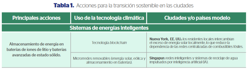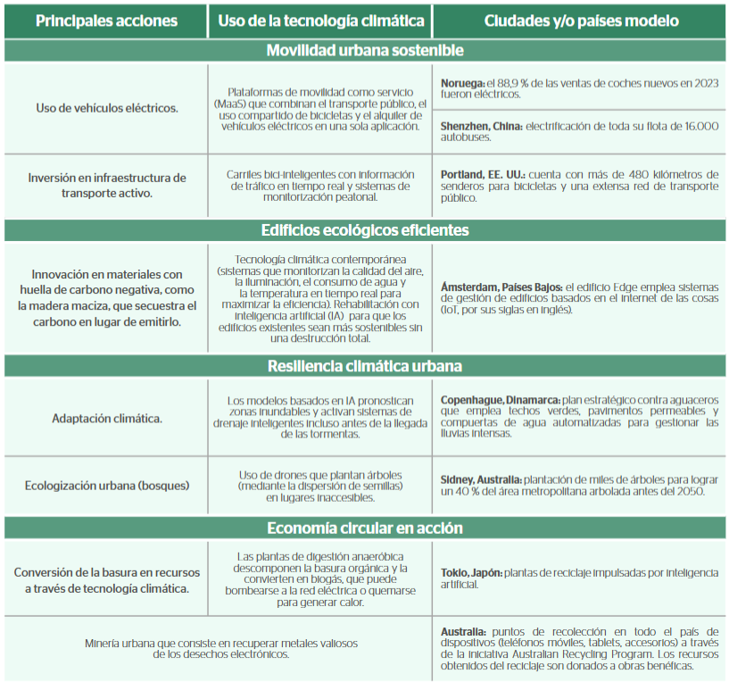 En ese sentido, lo sugerido por la representante de la IFC concuerda con lo que sostiene la doctora Emily Greenfield, experta en medio ambiente y en redacción de contenidos sobre este tema[5] respecto a la manera en que las ciudades deben liderar el camino hacia el objetivo de cero emisiones netas, dado que estas “son responsables de más del 70 % de las emisiones globales de CO₂” (Grennfield, 2025) y para lo cual el uso de la tecnología climática es un pilar esencial. En la tabla 1, se presentan algunas de las acciones más relevantes de sostenibilidad que pueden llevar a cabo las ciudades, como el uso de sistemas de energías inteligentes, optimización de la movilidad urbana, construcción de edificios ecológicos, fortalecimiento de la resiliencia climática urbana, adopción de estrategias y prácticas de economía circular, implementación de agricultura urbana, tratamiento de aguas residuales y restauración de los ecosistemas.