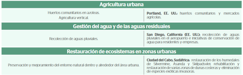 Asimismo, esta información se ha complementado con datos importantes de otras fuentes sobre prácticas sostenibles a nivel urbano que aportan a la descentralización energética, a la reducción significativa de la contaminación atmosférica y acústica, a una movilidad saludable, a la disminución del consumo de energía, a bajas emisiones de carbono, a la predicción para contrarrestar los riesgos climáticos, al incremento de la cobertura del dosel[6] urbano, a contrarrestar la contaminación, a aumentar el reciclaje y a restaurar los ecosistemas a través de Soluciones Basadas en la Naturaleza (SbN).